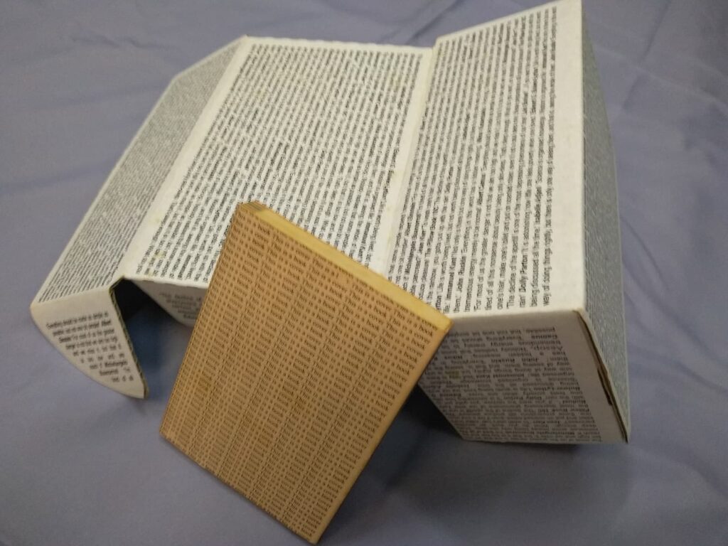 而 “This is a box. This is a book. ” 則是一個沒有裝內容物,但表面佈滿文字的空盒,空盒就是書,書就是空盒。兩者都顛覆了書原有的概念。